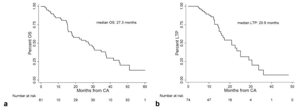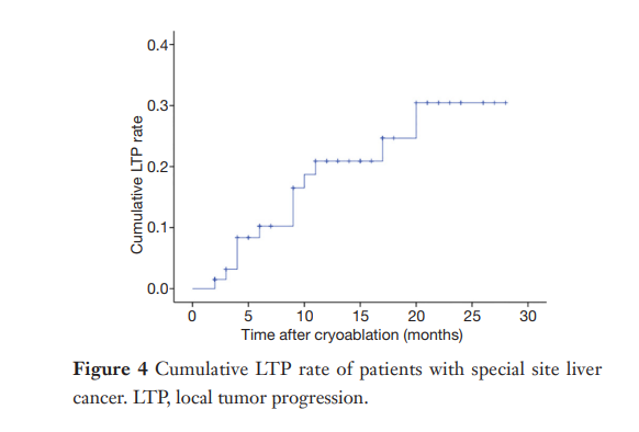 ③ 總生存曲線和局部腫瘤進(jìn)展曲線:冷凍消融后中位生存時(shí)間為 27.3 個(gè)月,中位局部腫瘤進(jìn)展時(shí)間為 20.9 個(gè)月。