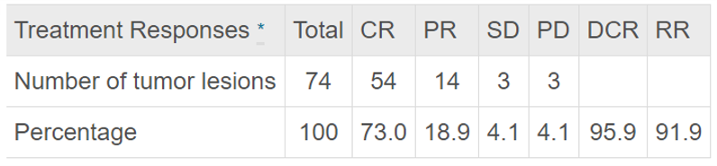 ① 術(shù)后 1 月腫瘤治療反應(yīng):冷凍消融術(shù)后一個(gè)月腫瘤疾病控制率達(dá)95.9%。