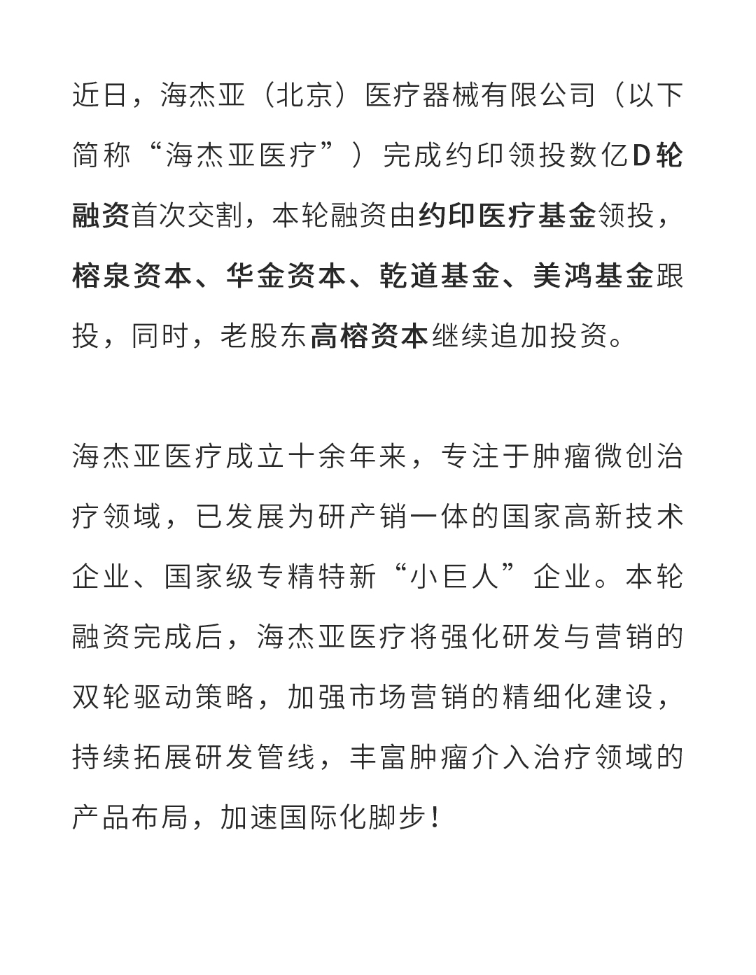 構(gòu)建腫瘤介入治療一體化平臺(tái),海杰亞完成約印領(lǐng)投數(shù)億D輪融資首次交割