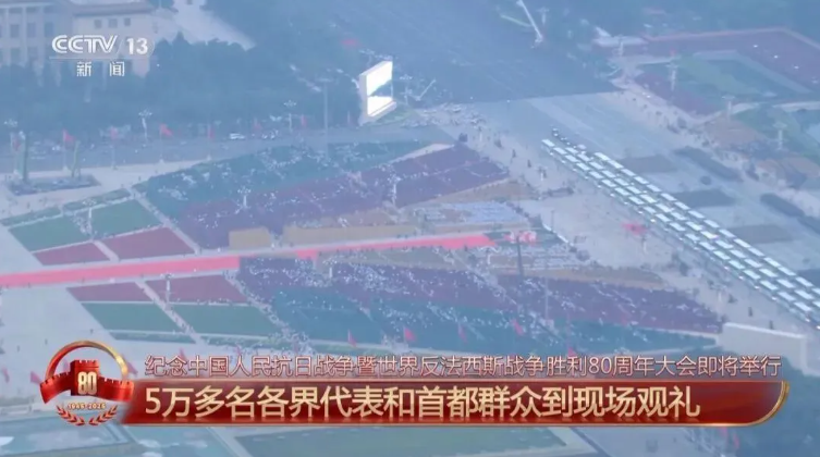 今天,數(shù)十位國際政要應(yīng)邀來華蒞臨現(xiàn)場,各界代表和首都群眾在長安街南北兩側(cè)現(xiàn)場近距離觀禮。從空中可以清晰地看到,廣場上觀禮區(qū)的布局呈現(xiàn)出三個“人”字,構(gòu)成了意象化的“眾”字,體現(xiàn)了眾志成城的意涵。